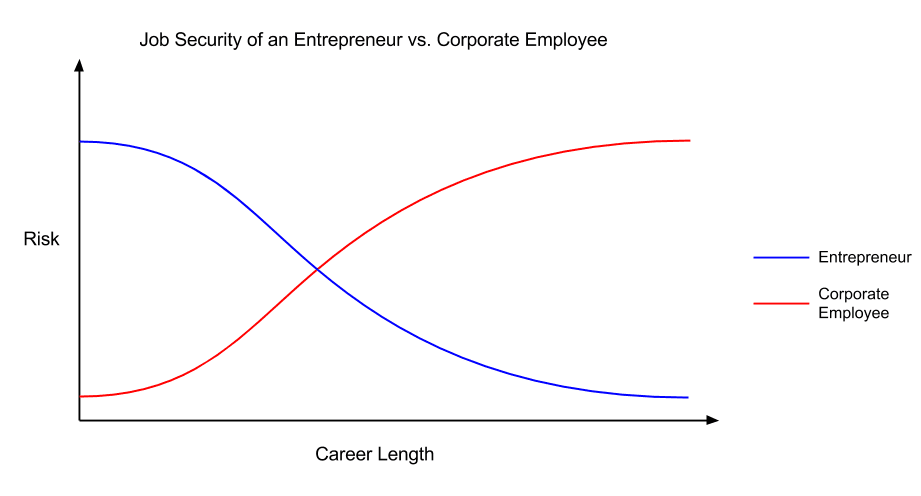 Now you certainly think I’m crazy, but hear me out. Initially, entrepreneurship is going to be much more risky than getting a job. It takes a while to build your company, your reputation, etc. However, as you progress in your career as an entrepreneur, your job security greatly increases as you become established. The only reason you lose your job is because mother capitalism says so.